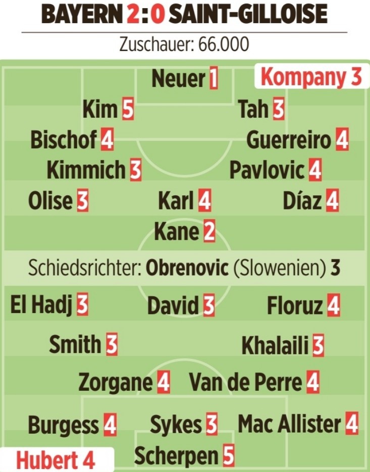 1月22日讯 在本轮欧冠,拜仁2-0击败圣吉罗斯。《图片报》也为拜仁球员本场表现做出评分,具体如下(德媒评分1分最高,5分最低):
