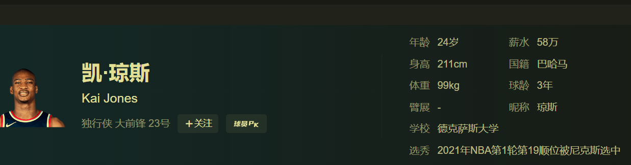 我看了一下凯琼斯的个人资料,出生于2001年1月19日的的凯琼斯,今年才24岁,非常的年轻有活力。身高是2米11,属于是标准的五号位身高,打内线不吃亏。